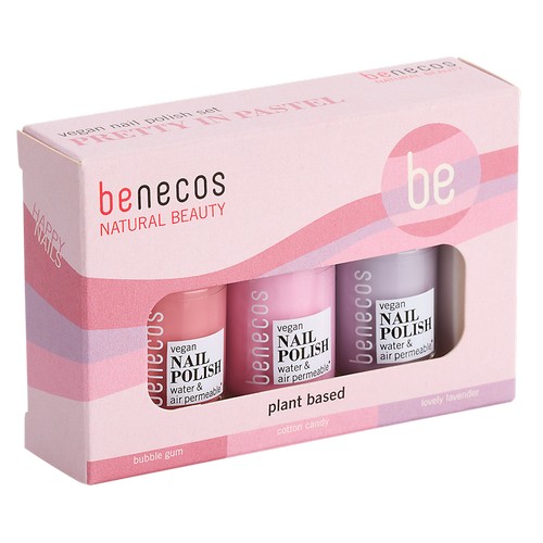 Nägel in pastell – stylisch und verspielt! Das benecos 20-FREE Nail Polish-Set besteht aus den Farben bubble gum, cotton candy und lovely lavender.