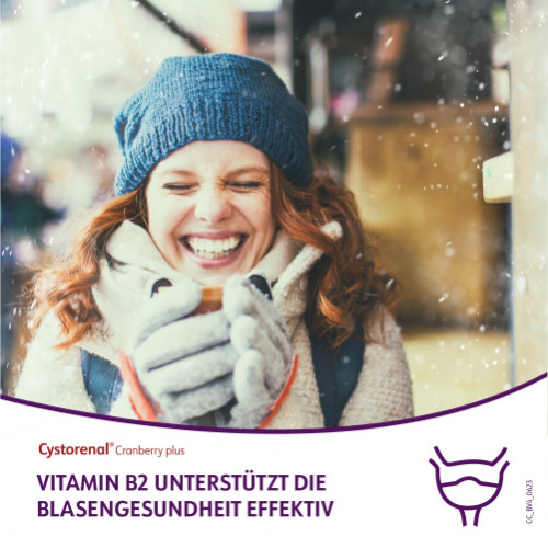 Cystorenal® Cranberry plus zum Erhalt einer gesunden Blase mit der besonderen Kombination aus Cranberry, Kürbiskern, Vitamin C und Vitamin B2. Vitamin B2 trägt zum Erhalt gesunder Schleimhäute bei, z. B. auch in der Blase; Vitamin C unterstützt die normale Funktion des Immunsystems und des Zellschutzes.