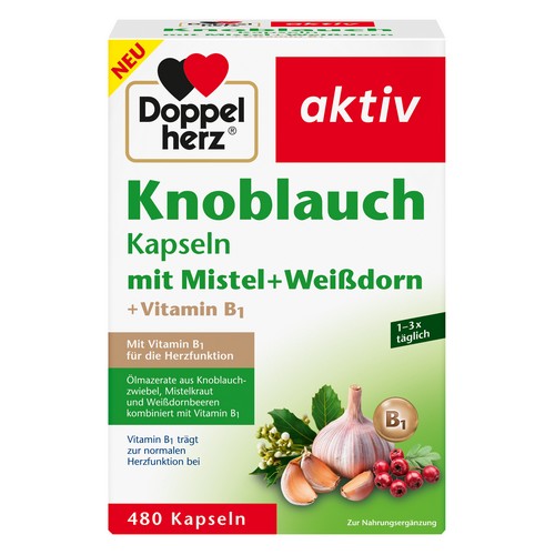 Dank ihrer magensaftresistenten Hülle lösen sich die Kapseln durch ein spezielles Herstellungsverfahren erst im Dünndarm auf. Dadurch sind sie weitgehend geruchlos und angenehm einzunehmen. Knoblauch – botanisch Allium sativum – stammt ursprünglich aus Westasien und zählt zu den ältesten Kulturpflanzen der Welt. Schon im alten Ägypten wurde Knoblauch in der Ernährung geschätzt. Auch in unseren Breiten erfreut er sich seit Langem großer Beliebtheit. Viele Menschen verzichten jedoch auf den Verzehr, da sie den intensiven Geruch als unangenehm empfinden. Neben Zubereitung aus Knoblauch enthalten die Kapseln auch Weißdorn (botanisch Crataegus), dessen rote Früchte durch ihren säuerlich-süßen Geschmack überzeugen und essbar sind. Ein weiterer Bestandteil ist ein Ölmazerat aus Mistelkraut, das von der immergrünen Mistel gewonnen wird. Diese besondere Pflanze wächst auf Bäumen, indem ihre Keimlinge ihre Wurzeln in den Wirtsbaum treiben und sich als „Schmarotzer“ von dessen Wasser und Nährstoffen ernähren. Abgerundet wird die Rezeptur durch Vitamin B1 (Thiamin), das zur normalen Funktion von Herz und Nervensystem beiträgt.