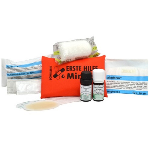 Blasenpflaster, elastische Binde, Pflasterstrips und Wundauflagen komplementieren das Erste-Hilfe-Set.