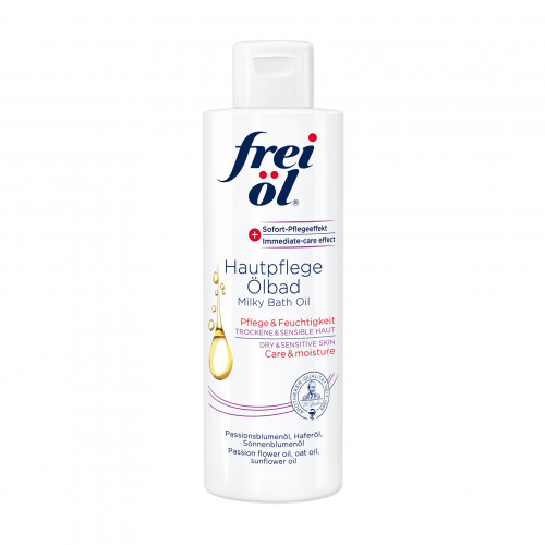 Das reichhaltige frei öl® HautpflegeÖlbad vereint entspannendes Baden und reichhaltige Hautpflege. Die Kombination aus pflegendem Sonnenblumenöl, entspannendem Passionsblumenöl und feuchtigkeitsspendendem Haferöl verwandelt sich im Badewasser zu einer wunderbar sanften milchigen Emulsion, die die Haut sofort mit einem feinen, pflegenden und zart duftenden Schutzmantel umhüllt. So bewahrt die Haut ihre Feuchtigkeit und wird vor dem Austrocknen geschützt.