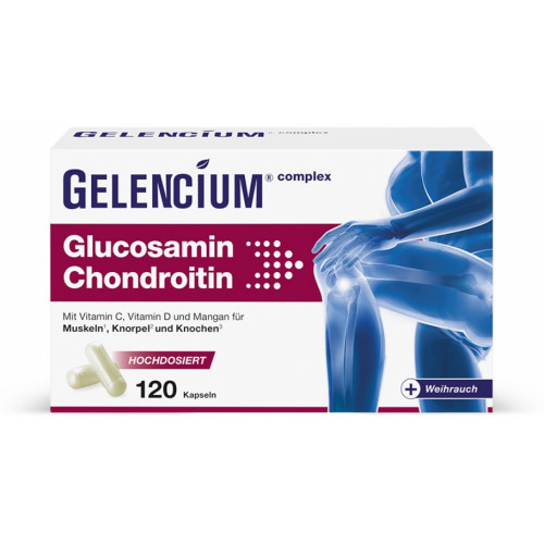 GELENCIUM® Glucosamin Chondroitin ist ein modernes, hochdosiertes Komplexpräparat der führenden Arthrose-Apothekenmarke GELENCIUM®. Dieses kombiniert erstmalig die essenziellen Gelenkbausteine Glucosamin und Chondroitin mit Weihrauch und ausgewählten Mikronährstoffen für die Gelenkgesundheit. Im Wettbewerbsvergleich herausragend ist die einzigartig hohe Tagesdosis von 2.325 mg Glucosaminsulfat + Chondroitinsulfat. Als ideale Ergänzung ist Weihrauch mit den entzündungshemmenden Boswelliasäuren enthalten. Die optimal aufeinander abgestimmten Mikronährstoffe Vitamin C, Vitamin D und Mangan unterstützen die Gelenkgesundheit (Knorpel2, Knochen3, Muskeln4, Bindegewebe5) zusätzlich.