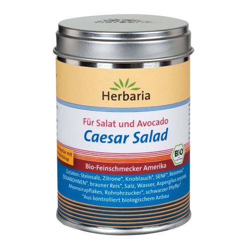 Herbaria Caesar Salad ist eine Bio-Gewürzmischung für den amerikanischen Salatklassiker nach dem italienischen Einwanderer und Chefkoch „Cesare Cardini“. Mit dieser Gewürzmischung und ihren aromatischen Zutaten wie etwa Zitrone, Knoblauch und Senf gelingt selbstverständlich auch eine vegetarische oder vegane Variante des Salatklassikers sowie auch eigene Salat-Kreationen. Durch die zitrische Note und den Knoblauch, passt Caesar Salad auch hervorragend zu Avocado, direkt drüberstreuen oder für Guacamole.