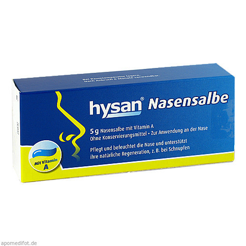 hysan® Nasensalbe ist eine sterile, konservierungsmittelfreie Salbe, die 138 µg/g Retinolpalmitat (entsprechend 250 I.E./g Vitamin A), dickflüssiges Paraffin, dünnflüssiges Paraffin, Wollwachs und weiße Vaseline enthält.