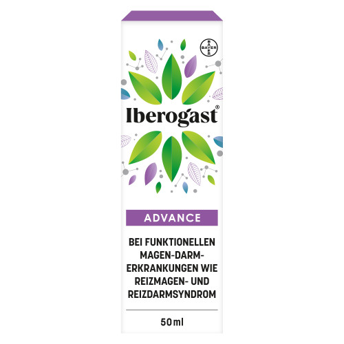 Iberogast® ADVANCE. Pflanzliches Arzneimittel bei Magen-Darm-Erkrankungen. Behandlung von funktionellen Magen-Darm-Erkrankungen wie Reizmagensyndrom (funktionelle Dyspepsie) und Reizdarmsyndrom (Colon irritabile). Das Arzneimittel enthält 31 Vol.-% Alkohol. Stand: 12/2020. Bayer Vital GmbH, Kaiser-Wilhelm-Allee 70, 51373 Leverkusen, Deutschland.