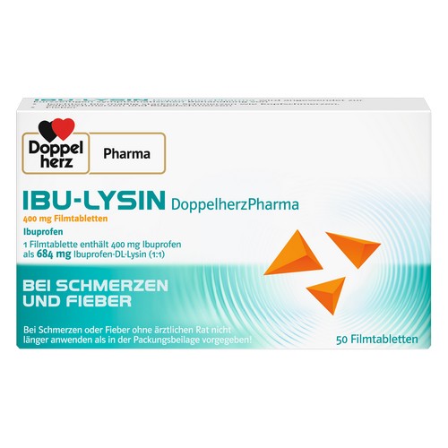 IBU-LYSIN DoppelherzPharma 400 mg Filmtabletten. Wirkstoff: Ibuprofen. Zusammensetz.: Jede Filmtablette enthält 400 mg Ibuprofen (als 684 mg Ibuprofen-DL-Lysin (1:1)).