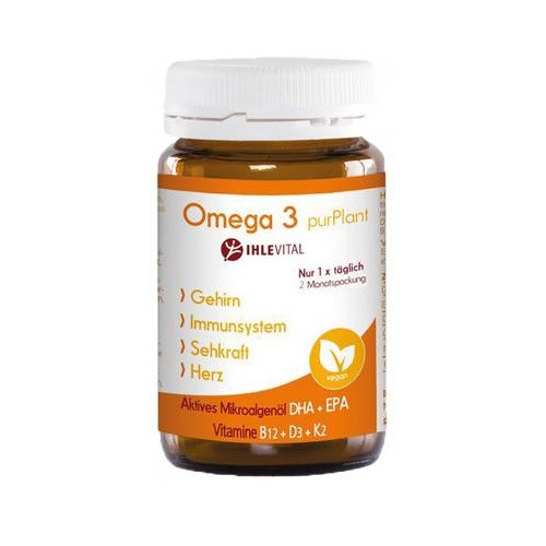 Omega3 purPlant ist ein aktives und veganes Microalgenöl mit den mehrfach ungesättigten Fettsäuren DHA, EPA, DPA sowie Vitamin B12 und D3.
