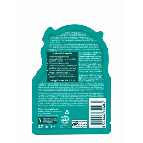 Ab in die Wanne mit dem Kneipp® naturkind Matschmonster Wind & Wetter Schaumbad! Das türkisgrüne Schaumbad mit natürlichen Ölen aus Thymian und Minze durchwärmt kleine Räuber nach einem erlebnisreichen Schmuddelwettertag. Wertvolles Wunderbaumöl pflegt zarte Kinderhaut und schützt sie vor dem Austrocknen. Mit Farbe und langanhaltendem Schaum zum Entdecken und Experimentieren – so wird Baden spielerisch zu einem Erlebnis für die kindlichen Sinne! Die Kneipp® naturkind Produkte haben wir mit ganz viel Liebe speziell für unsere Kinder entwickelt. Sie sind die ideale Kombination aus Pflege und Spaß – für Kinder ab 3 Jahren.