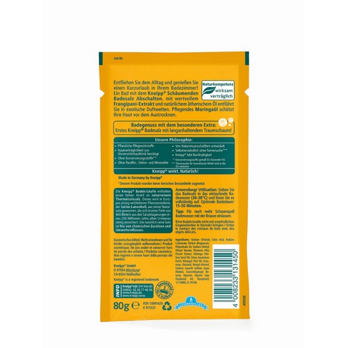Entfliehen Sie dem Alltag und genießen Sie einen Kurzurlaub in Ihrem Badezimmer! Ein Bad mit dem Kneipp® Schäumenden Badesalz Abschalten. mit wertvollem Frangipani-Extrakt und natürlichem ätherischem Öl entführt Sie in exotische Duftwelten. Pflegendes Moringaöl schützt Ihre Haut vor dem Austrocknen. Die Kneipp® Badekristalle enthalten einen hohen Anteil an naturreinem Thermalsolesalz. Dieses wird in Europas einzig verbliebener Pfannensiederei, der Saline Luisenhall, aus reiner Natursole gewonnen, die sich in einer Tiefe von 460 Metern aus den Salzablagerungen eines 250 Millionen Jahre alten Urmeeres stetig anreichert. Die natürlich reine Sole ist frei von chemischen Zusätzen und Umwelteinflüssen. Badegenuss mit dem besonderen Extra: Erstes Kneipp® Badesalz mit langanhaltendem Traumschaum!