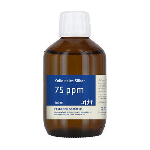 Das kolloidale Silber 75 ppm wird mit hochreinem destillierten Wasser unter qualifizierten Laborbedingungen frisch hergestellt und in einer dunklen Glasflasche geliefert. Die Herstellung erfolgt in der Apotheke unter überwachten Laborbedingungen. Das kolloidale Silber wird auf elektrolytischem Wege mit Hilfe eines entsprechenden Generators hergestellt. Dabei werden aus 99,99% reinem Silber kleinste Partikel gebildet und in destilliertem Wasser verteilt. Wir arbeiten dabei ohne Einsatz von Zusatzstoffen. Bitte beachten Sie: Kolloidales Silber ist kein Arzneimittel und daher auch ohne Angabe einer Indikation. Aus rechtlichen Gründen bieten wir daher das kolloidale Silber nur für technische Zwecke an. Nicht zum Einnehmen.