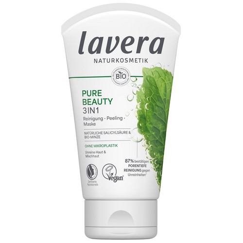 Die Pure Beauty 3in1 Reinigung, Peeling und Maske von Lavera sorgt für eine porentiefe Reinigung, ohne dabei die Haut auszutrocknen. Mit natürlicher Salicylsäure und Bio-Minze wird Unreinheiten effektiv vorgebeugt. Die Peelingkörner entfernen abgestorbene Hautschuppen und fördern die Hauterneuerung.