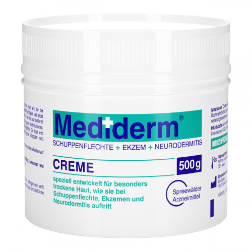 Mediderm® Creme wurde speziell entwickelt für besonders trockene Haut, wie sie bei Schuppenflechte, Ekzemen und Neurodermitis auftritt. Die Creme spendet Feuchtigkeit und bildet eine Schutzbarriere, wodurch der Feuchtigkeitsgehalt aufrechterhalten und die Haut vor äußeren Einflüssen geschützt wird. Sie unterstützt die Linderung von Hautirritationen, Brennen und Juckreiz sowie die Aufrechterhaltung eines entspannten Hautgefühls. Die Haut wird beruhigt, glatt und geschmeidig, wodurch bei regelmäßiger Anwendung die Schuppen- und Rissbildung reduziert wird. Mediderm® Creme zieht schnell ein, hinterlässt keinen Fettfilm und verursacht keine Flecken auf Kleidung und Bettwäsche. Mediderm® Creme ist frei von SLS (Natriumlaurylsulfat), Parabenen und künstlichen Farb- und Duftstoffen. Geeignet ab dem ersten Lebensmonat.