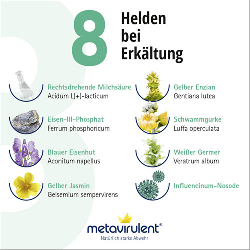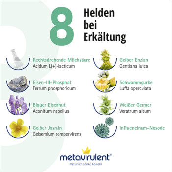Bei akuten Zuständen bzw. den ersten Anzeichen einer Erkältung über zwei Tage bis zu 12x täglich je 5–10 Tropfen einnehmen. Dabei sollten die Tropfen einige Zeit im Mund belassen werden, damit sie von der Mundschleimhaut aufgenommen werden können. Alternativ kann metavirulent auch in ein Glas mit Flüssigkeit getropft und mit etwas Wasser zusammen eingenommen werden. Bei Nachlassen der Beschwerden sollte die Dosis reduziert werden, bis die Erkältung abgeklungen ist.
