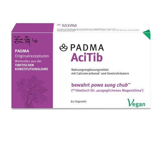 Die Verdauung ist in der Tibetische Konstitutionslehre von zentraler Bedeutung. Nur wenn die aufgenommene Nahrung vollständig zerlegt und verstoffwechselt wird, können die Nährstoffe optimal vom Körper genutzt werden. PADMA AciTib basiert auf der Originalrezeptur Cong zhi 6. Cong zhi ist tibetisch für Calcium und die Zahl 6 steht für die sechs in PADMA AciTib enthaltenen Inhaltsstoffe. Die Eigenschaften von PADMA AciTib sind charakteristisch für: