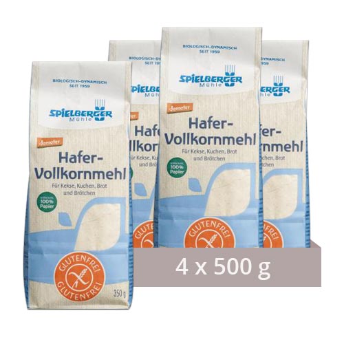 Für das glutenfreie Hafer-Vollkornmehl wird das ganze Korn zuerst gedarrt, dann gedämpft und anschließend zu feinen Flocken gewalzt. Dadurch bleiben alle Inhaltsstoffe des vollen Getreidekorns erhalten. Anschließend werden die Flocken zu Hafer-Vollkornmehl vermahlen, was ihm ein besonders aromatisches und fein-nussiges Aroma verleiht. Es eignet sich hervorragend für das glutenfreie Backen und stellt in Mischung mit anderen glutenfreien Mehlen und einem Bindemittel wie Johannisbrotkernmehl oder Guarkernmehl eine Alternative zu glutenhaltigen Backmehlen dar.