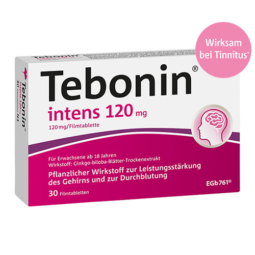 Tebonin® intens 120 mg. Wirkstoff: Ginkgo-biloba-Blätter-Trockenextrakt. Anwendungsgebiete: Zur unterstützenden Behandlung von Ohrgeräuschen infolge von Durchblutungsstörungen oder altersbedingten Rückbildungsvorgängen (Tinnitus vaskulärer und involutiver Genese). Häufig auftretende Schwindelgefühle und Ohrensausen bedürfen grundsätzlich der Abklärung durch einen Arzt. Bei plötzlich auftretender Schwerhörigkeit bzw. einem Hörverlust sollte unverzüglich ein Arzt aufgesucht werden. Zu Risiken und Nebenwirkungen lesen Sie die Packungsbeilage und fragen Sie Ihre Ärztin, Ihren Arzt oder in Ihrer Apotheke. Dr. Willmar Schwabe GmbH & Co. KG – Karlsruhe