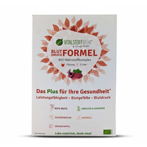 Die Vitalstoffwerk Blutdruckformel ist ein konzentrierter BIO-Nährstoffkomplex und kann pur oder verdünnt eingenommen werden. Je nach Bedarf 1-2 Portionen (1 Portion = 60ml) pro Tag.