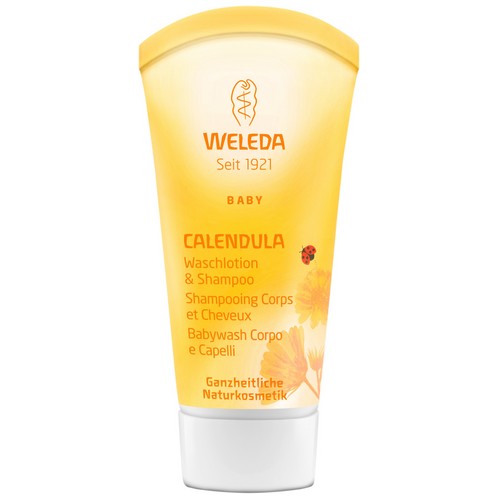 Die mild duftende Weleda Calendula Waschlotion & Shampoo reinigt Babys Haut und Haare behutsam und pflegt sanft.