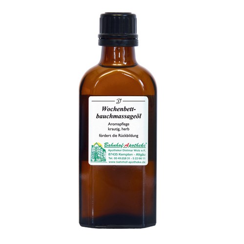 Ab dem 1. Tag nach der Geburt mit dem in den Handflächen körperwarmem Öl den Bauch kräftig und mehrmals täglich einmassieren. Das Wochenbettbauchmassageöl kann bis zu mehrere Monate nach der Geburt verwendet werden.